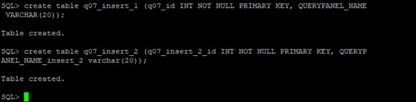 SQL> create table q07_insert_2 (q07_insert_2_id INT NOT NULL PRIMARY KEY, QUERYPANEL_NAME_insert_2 varchar(20));