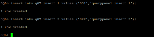 SQL> insert into q07_insert_2 values (‘022′,’querypanel insert 2’);
