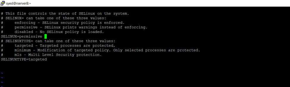 [syed@rserver8 ~]$ sudo  vi /etc/selinux/config