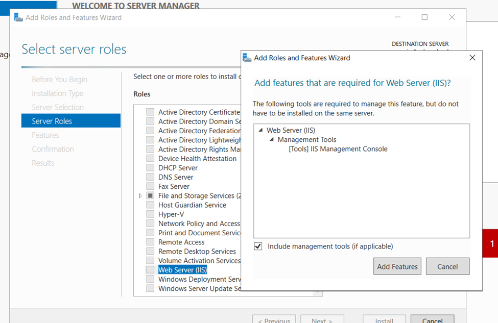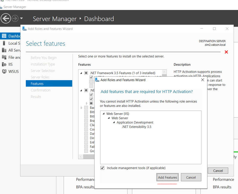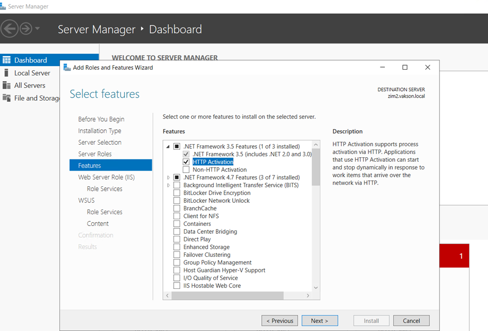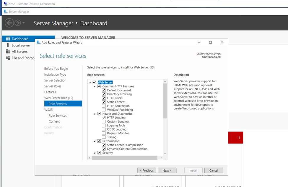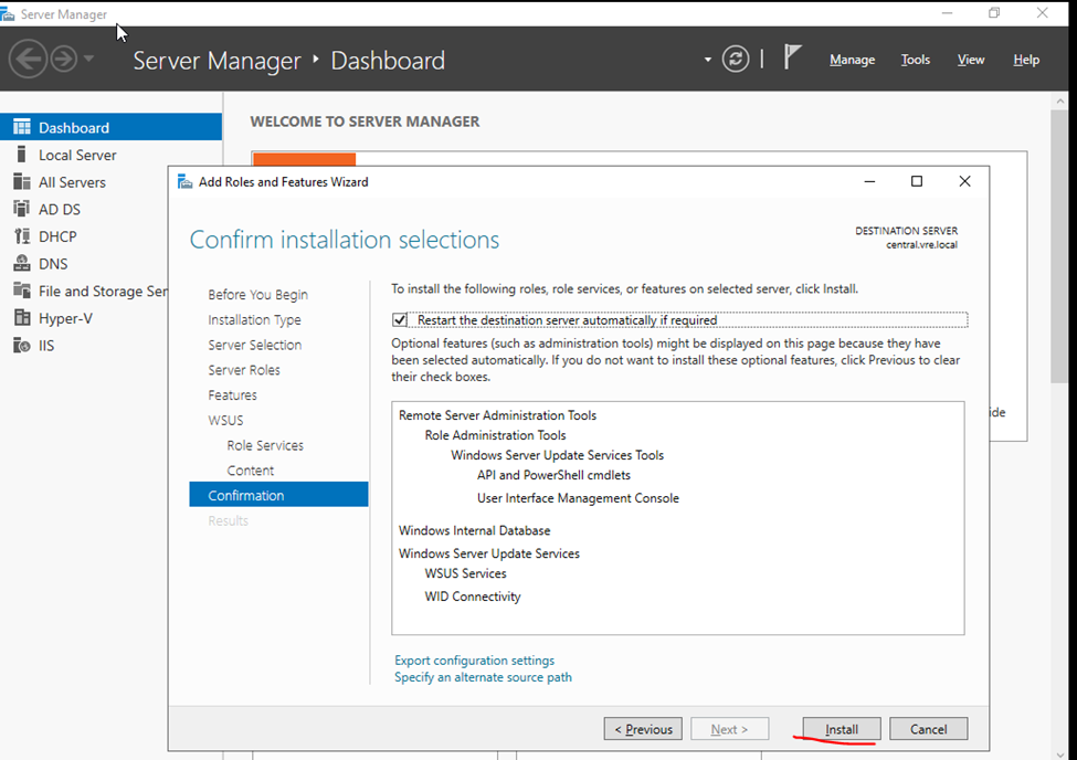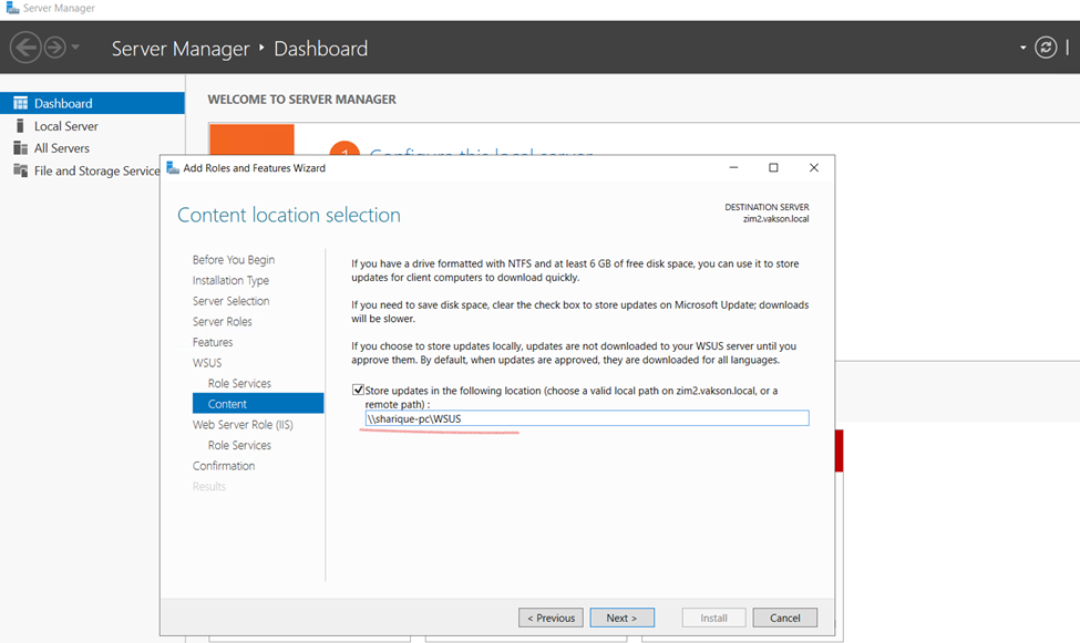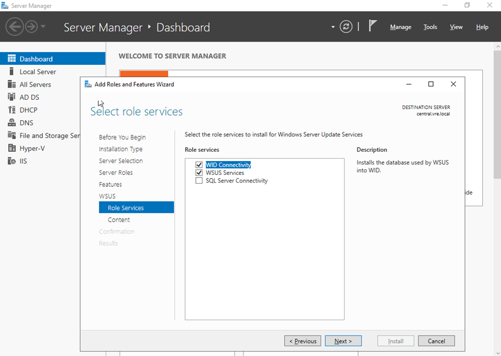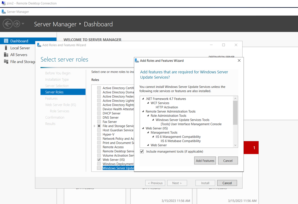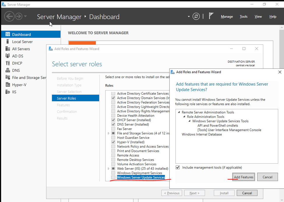 On the Server roles page, select the role Windows Server Update Services. You should see Add features that are required for Windows Server Update Services box. Click Add Features, and then click Next.