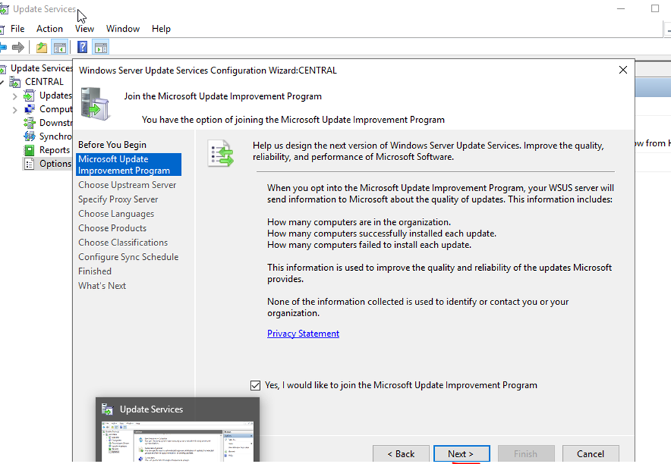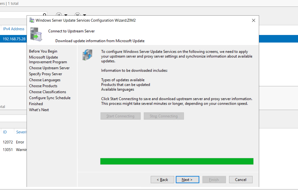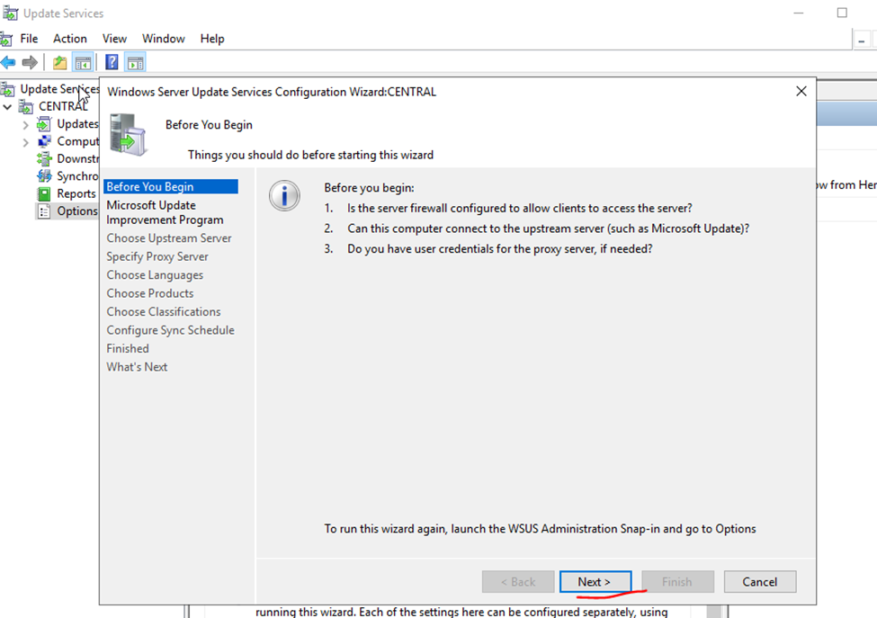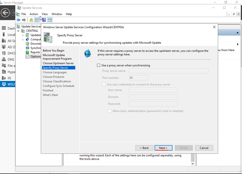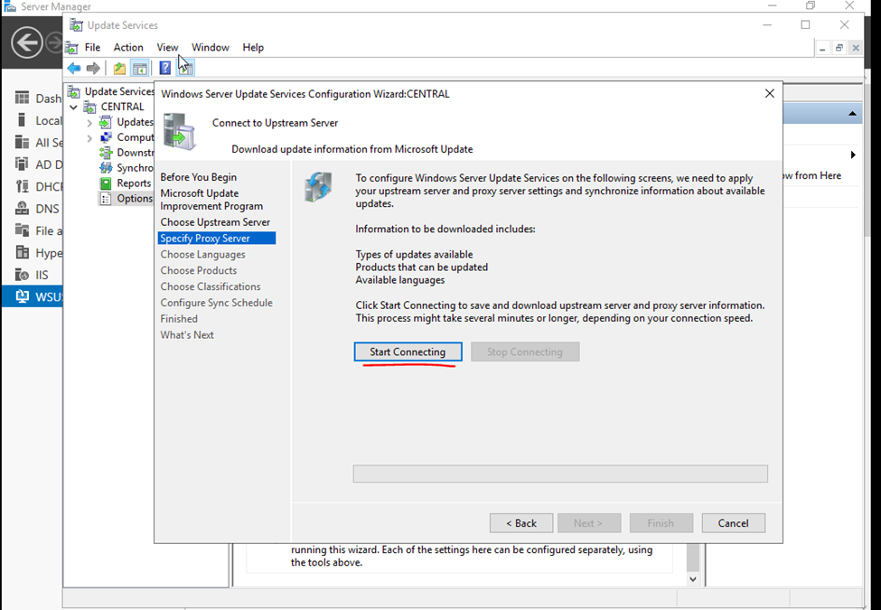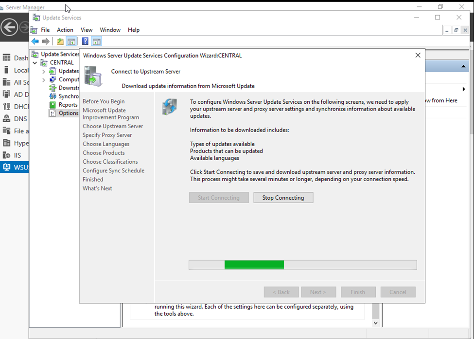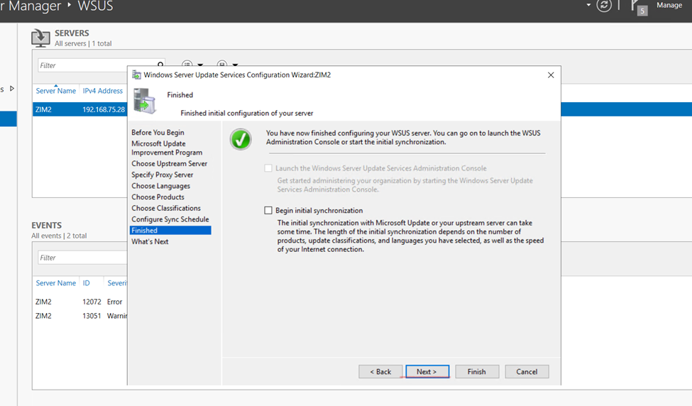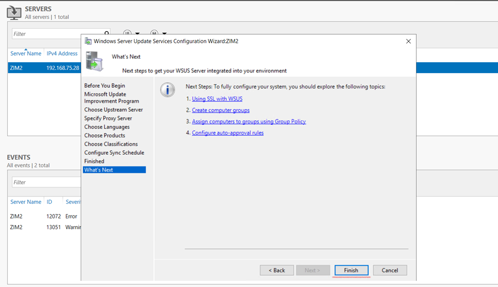 Finally on the last page, click Finish. This completes the steps to configure WSUS