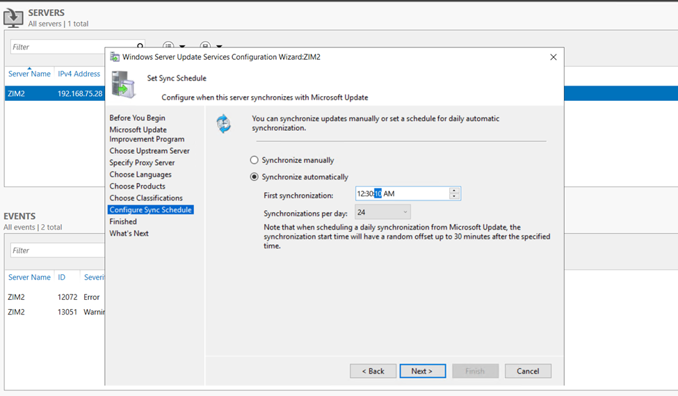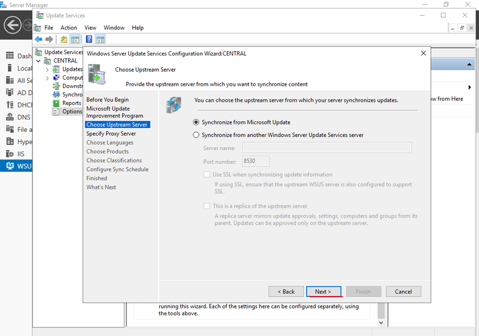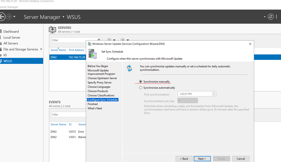 If you choose Synchronize manually, you must manually start the synchronization process from the WSUS Administration Console. With this option selected, you have to manually perform the sync every time. Therefore do not select this option if you are setting up the WSUS in production.