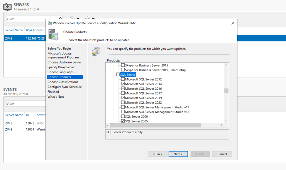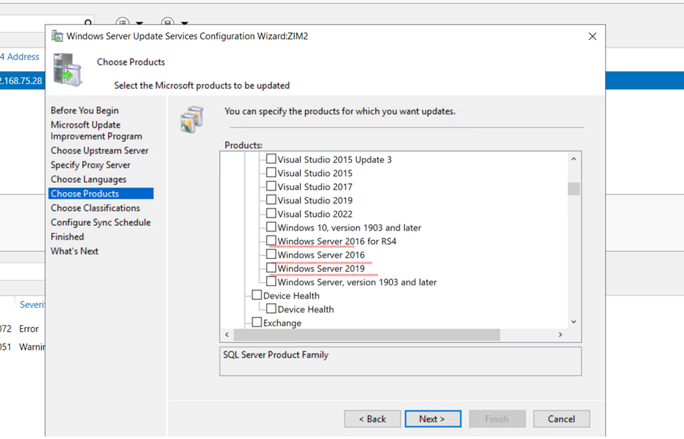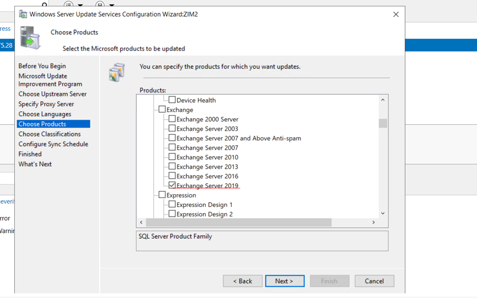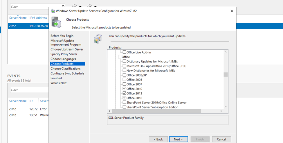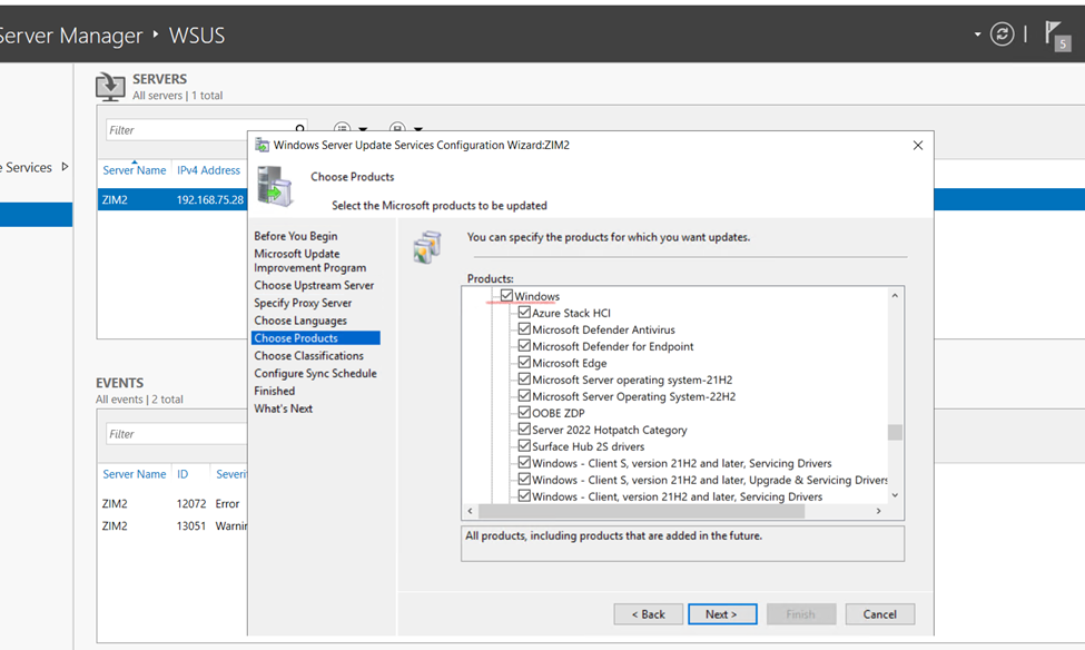 On the Choose products screen, check all products you wish to update. Scroll down to the Windows section and uncheck it. Then check only the Windows versions you have in your environment.
