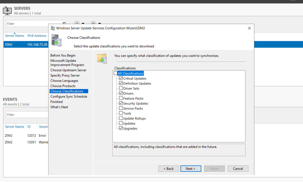 Choose Clarifications screen offers option to determine Windows update classifications you wish to download.
