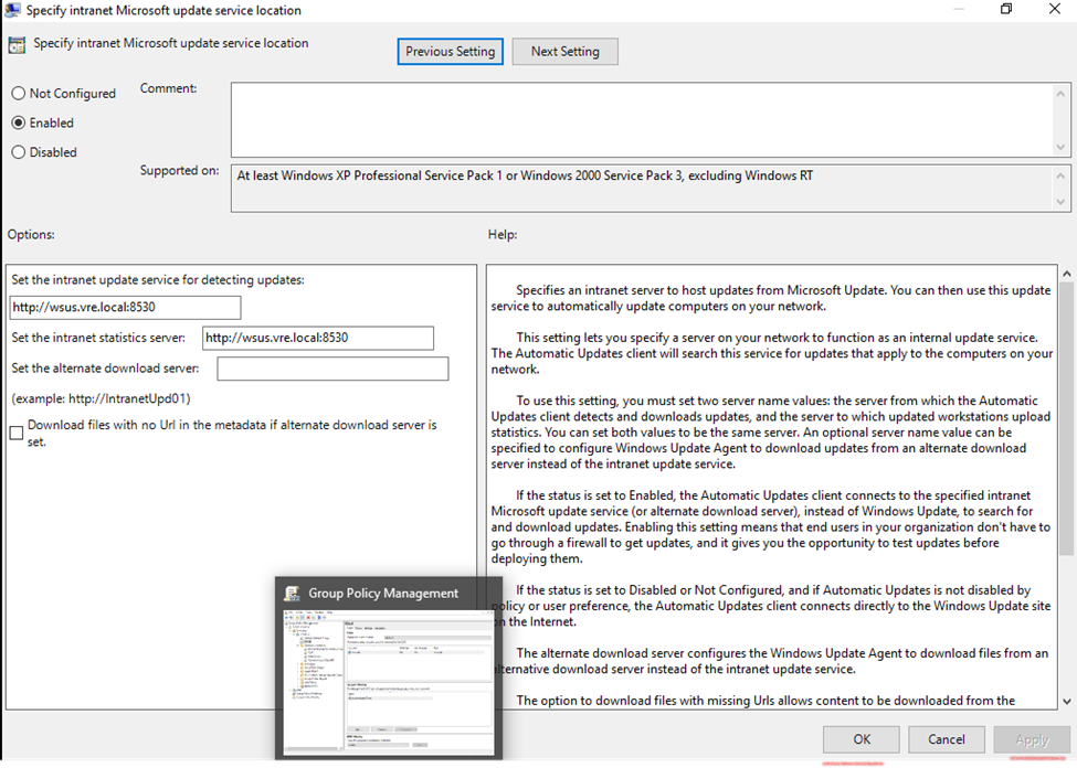To enable the policy, click Enabled. Specify the intranet update service and intranet statistics server. Click Apply and OK